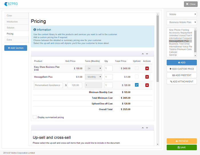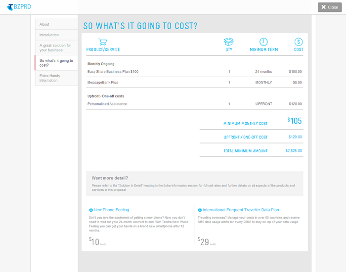 - Online portal for building consistent and personalised business proposal for a wide range of Telstra products, plans and services. Rolled out to all Telstra Business Centres and associated resellers across Australia.